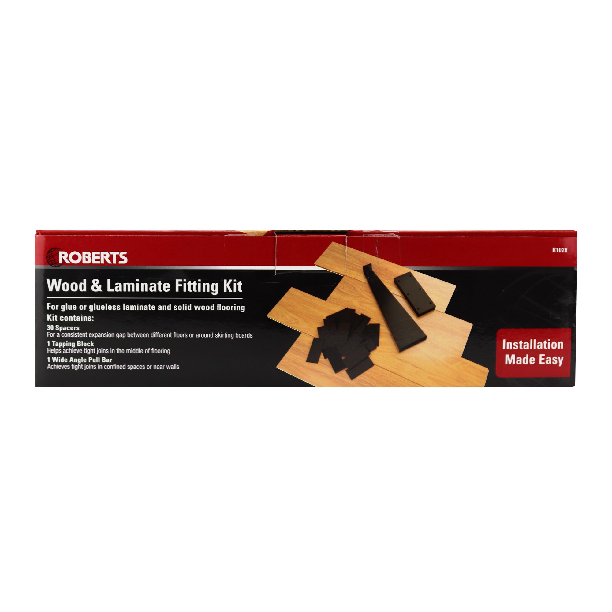 Roberts Wood Laminate Fitting Kit R1028. Fitting Kit is used to install tongue and groove flooring as well as glue-down and floating floor applications. Includes a Tapping Block, Pull Bar and 30 Laminate Spacers.